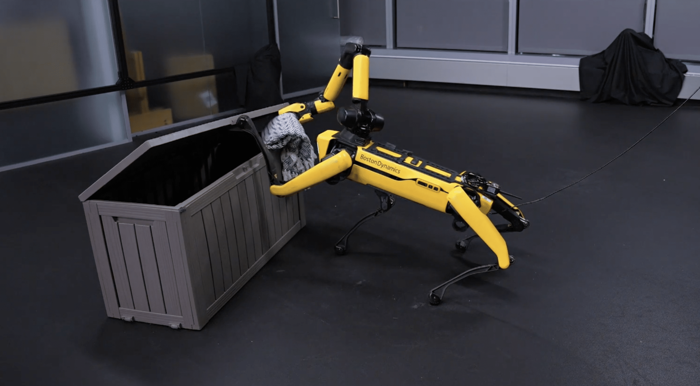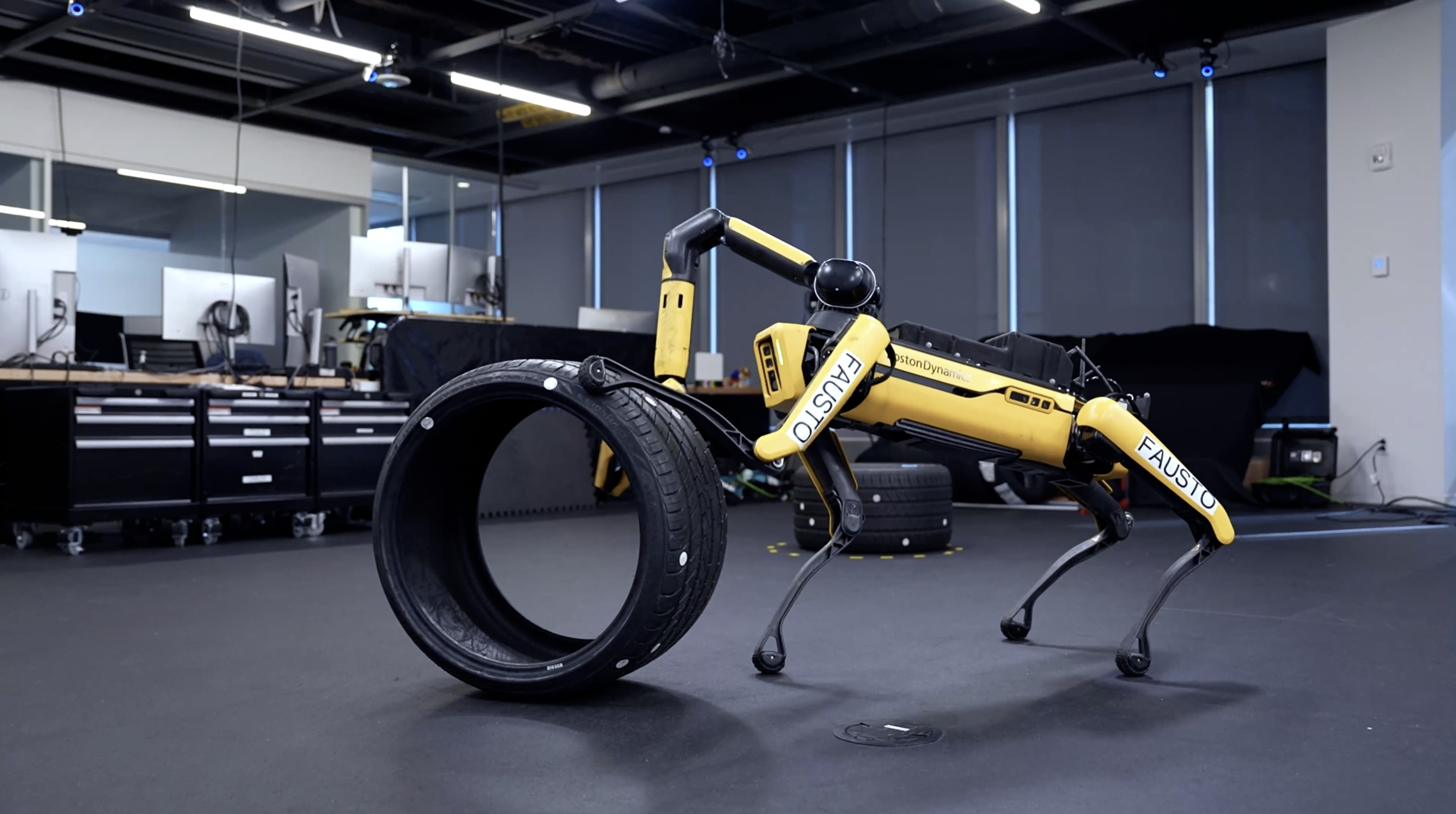 Spot uses dynamic whole-body manipulation to autonomously upright, roll, drag, and stack 15kg car tires using an approach that combines reinforcement learning and sampling-based optimization